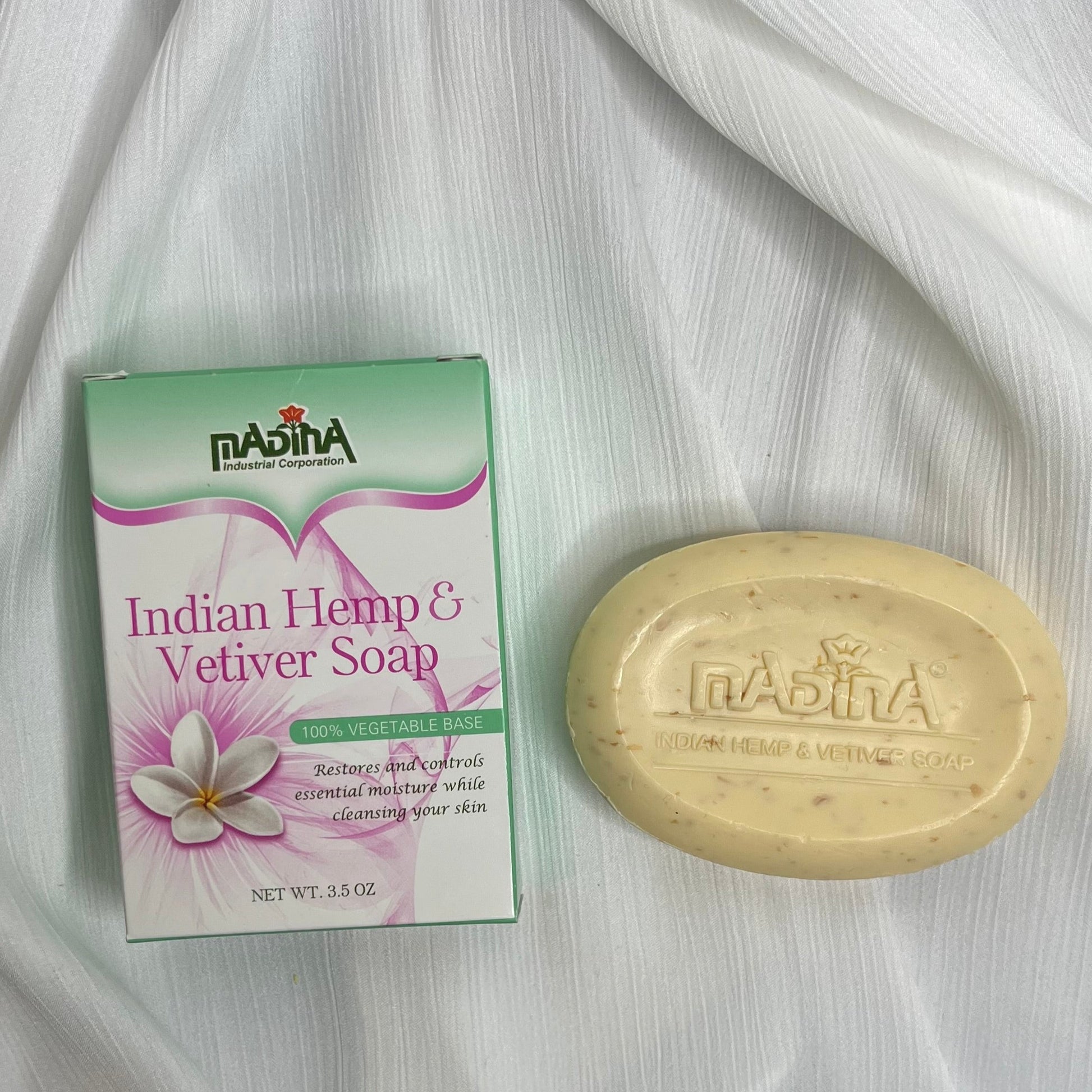 Indian Hemp & Vetiver Soap has the healing properties of Shea Butter mixed with Indian Hemp that helps rejuvenate and balance your skin. Our formula is infused with vetiver fragrance that helps relax your mind and body. Restores and controls essential moisture while cleansing your skin. Halal ingredients.