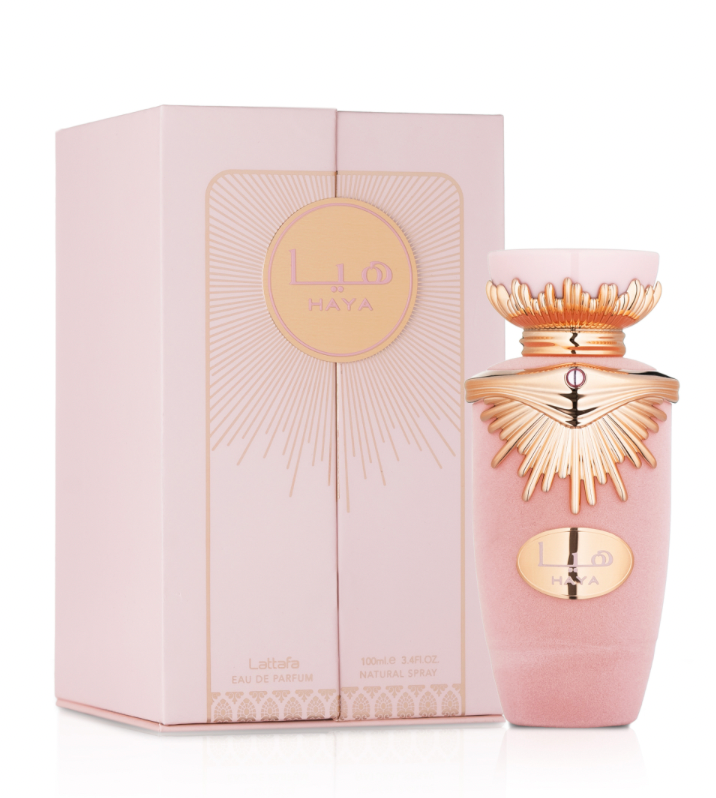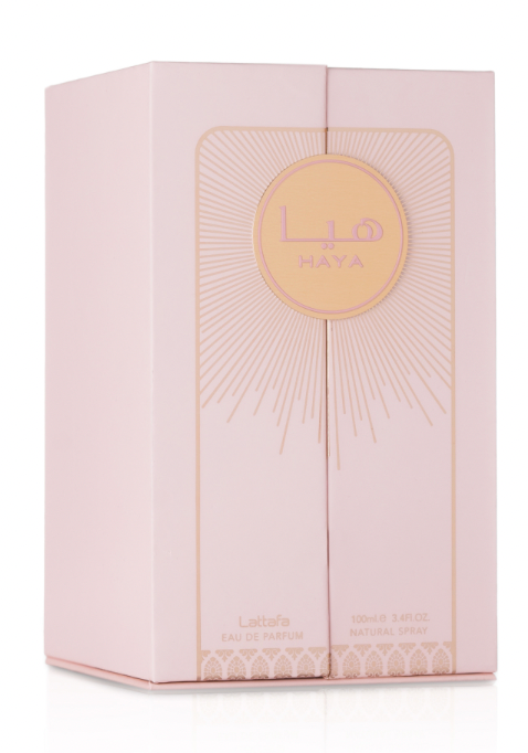 Haya by Lattafa Perfumes is a fragrance for women. This is a new fragrance. Haya was launched in 2022. Top notes are Champagne, Strawberry, Rose, Tangerine and Blood Orange; middle notes are Gardenia, Jasmine and Vanilla Orchid; base notes are Amber, Sandalwood and Chestnut.
