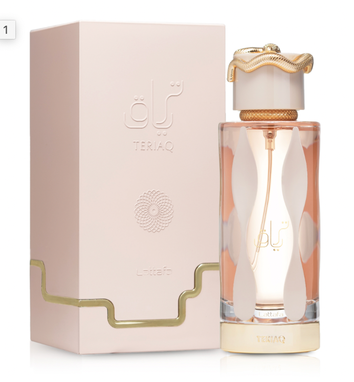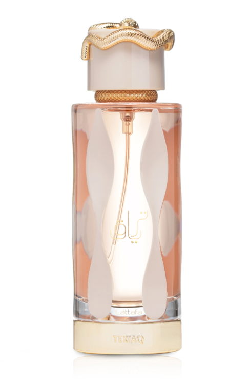 Teriaq by Lattafa Perfumes is a fragrance for women and men. This is a new fragrance. Teriaq was launched in 2024. The nose behind this fragrance is Quentin Bisch. Top notes are Pink Pepper, Caramel, Bitter Almond and Apricot; middle notes are Honey, White Flowers, Rhubarb and Rose; base notes are Vanilla, Leather, Labdanum, Musk and Vetiver.