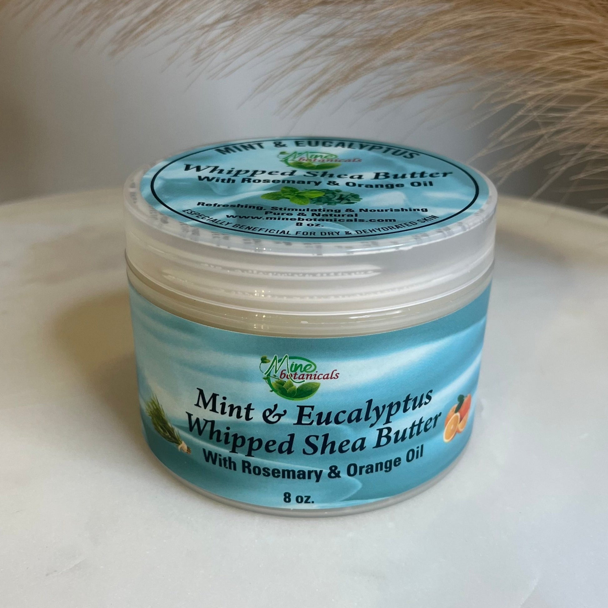 Our mint and eucalyptus whipped shea butter is made with peppermint and eucalyptus oils, which may help ease swelling, skin inflammation, joint inflammation, reduce redness, and calm itchiness. Mint - and eucalyptus are an excellent salicylic acid source, which works by loosening dead skin cells and preventing them from clogging pores. Mints’ astringent properties may reduce the oiliness of acne-prone skin and helps restore skin hydration.