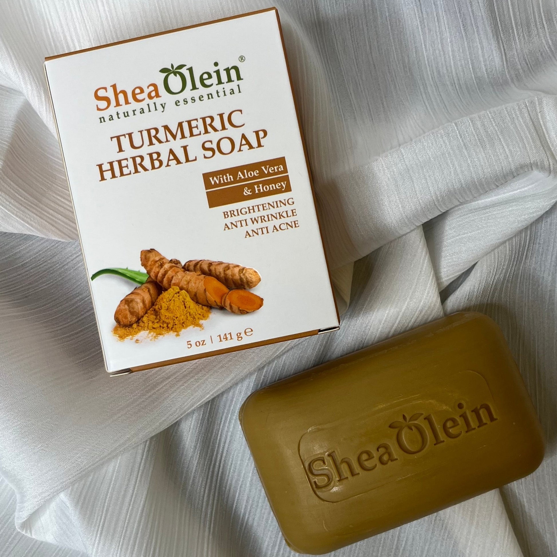 Shea Olein Turmeric herbal Soap contains antimicrobial, anti-inflammatory and antioxidant properties have been shown to reduce the appearance of wrinkles, as well as brighten the skin by lightening dark spots and improving overall skin tone. Aloe Vera and Manuka Honey offers soothing and healing properties, and helps to fight aging skin as well as reducing infection and acne.