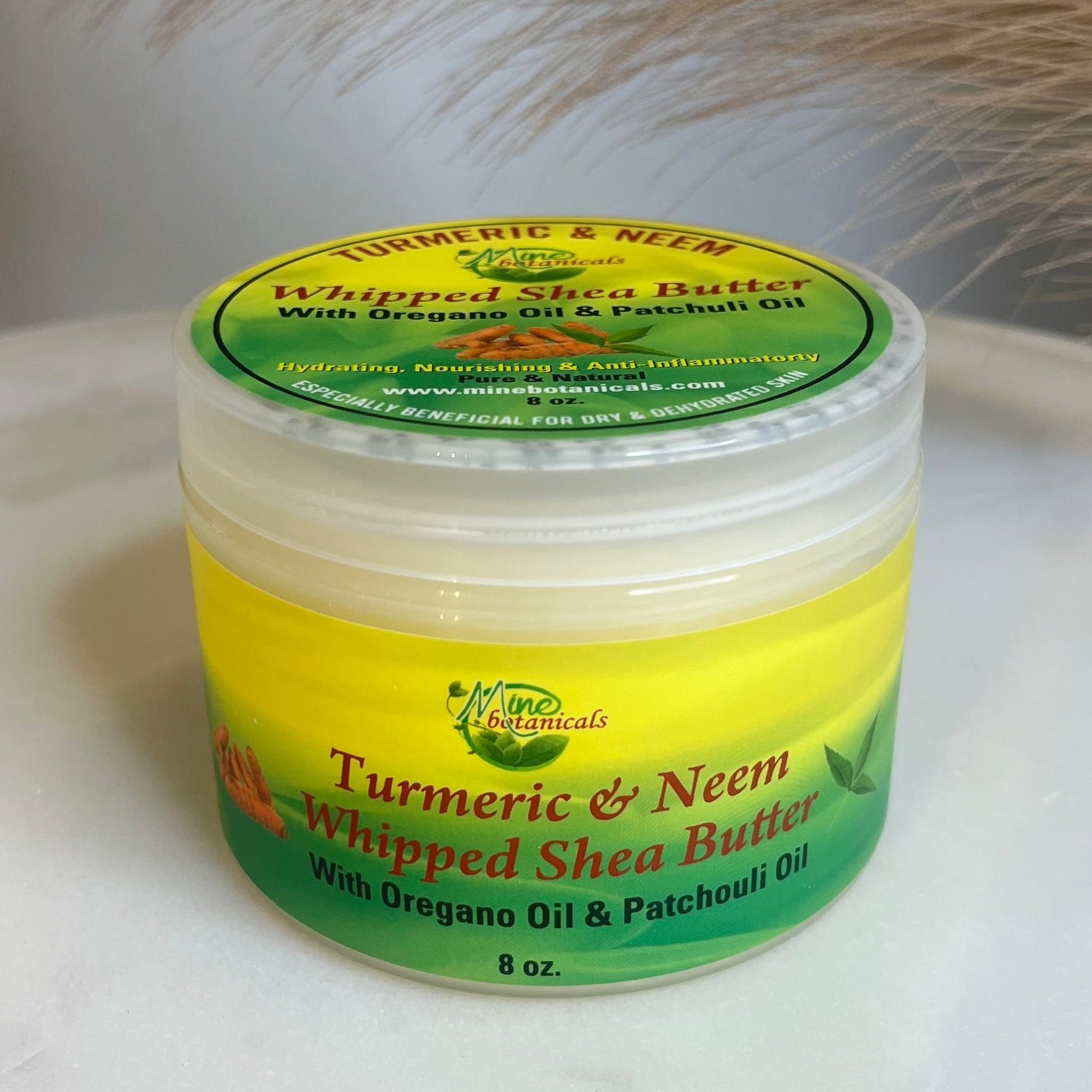 Details: Our turmeric and neem whipped shea butter is a powerful antioxidant and anti-inflammatory with skin benefits. Turmeric includes glow and luster of the skin, speeding up wound healing, calming the pores to decrease acne, and controlling psoriasis flares. Neem soothes dry skin, irrita tion and stops the body from producing histamines and - other chemicals that cause flakiness, swelling, and redness.