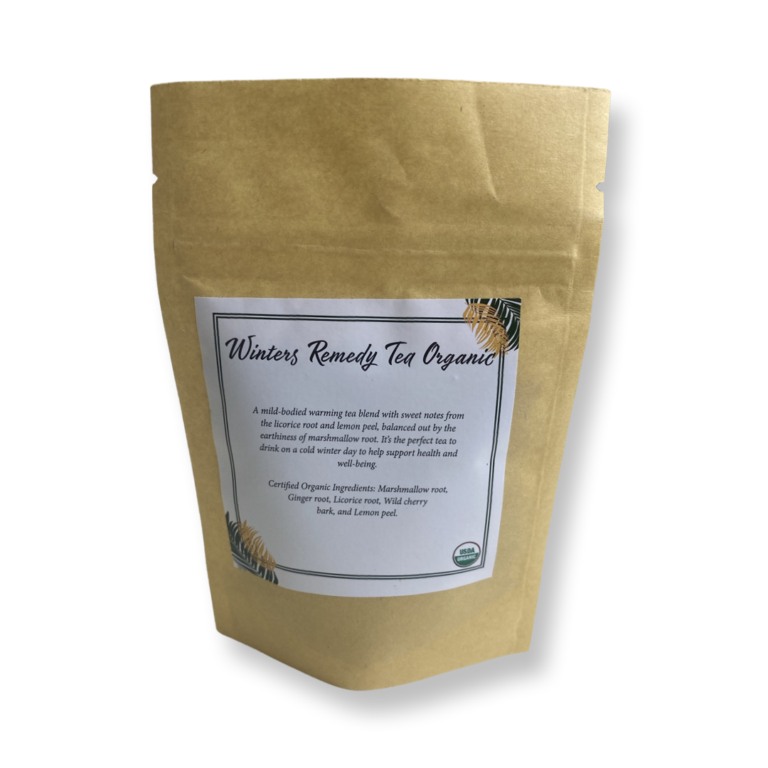 Introducing our Winter Remedy Tea, a soothing and comforting blend of organic Marshmallow root, Ginger root, Licorice root, Wild cherry bark, and Lemon peel. This carefully crafted herbal tea provides a delightful combination of flavors while offering potential health benefits to support you during the winter season.
